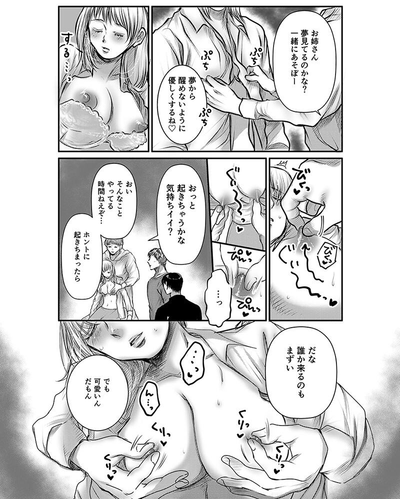 最初は「お姉さん、大丈夫かな?」と気遣っていたはずが、起きない彼女の様子に、3人の空気が変わっていく……。