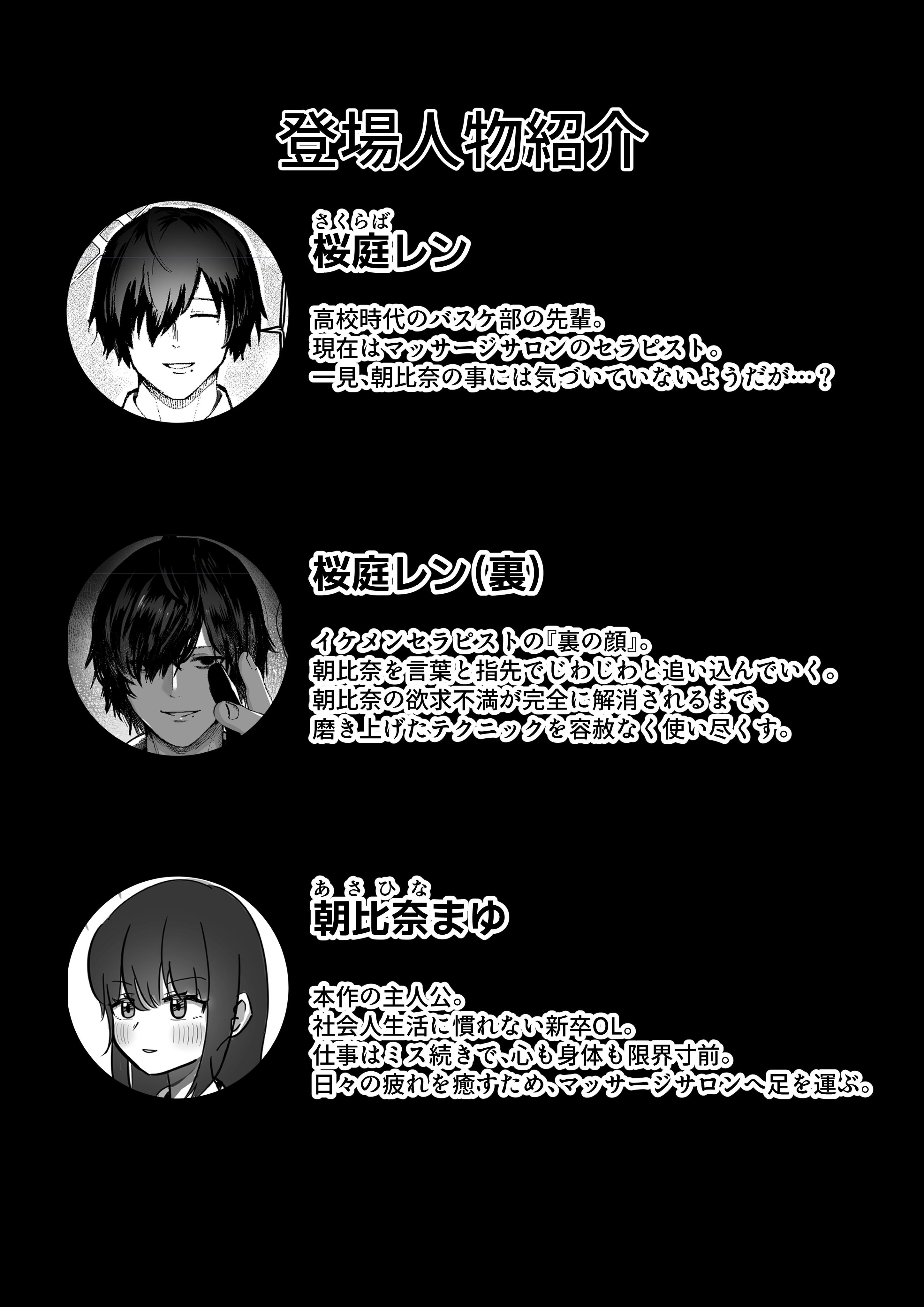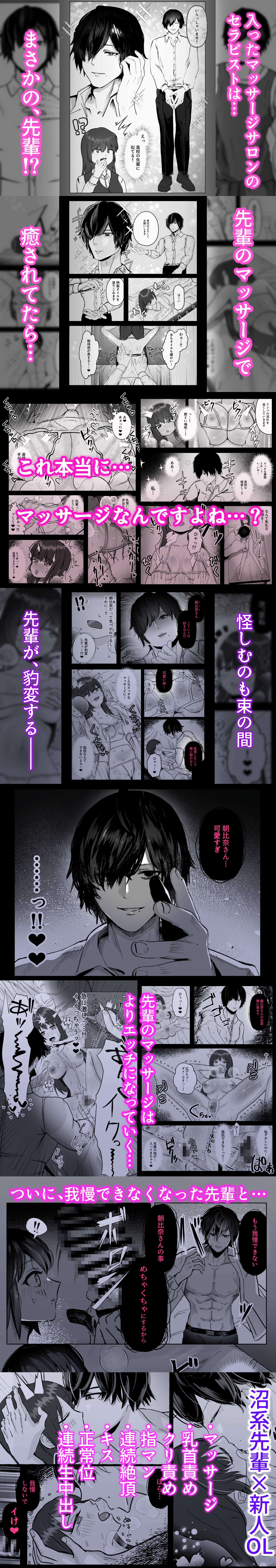 内容紹介 ▼あらすじ 仕事でミス続きの新人OL「朝比奈(あさひな)まゆ」。 心身を癒す為訪れたマッサージサロンのセラピストは、まさかの高校時代に片思いしてた先輩「桜庭(さくらば)レン」だった。 丁寧なマッサージに身を委ねていると、段々と際どい箇所の施術になり…? マッサージが進むと先輩の「裏の顔」が見え始める。 豹変した先輩はもう止まらない。 巧みな手技で絶頂させ続けられ、ついに桜庭レンは屹立した竿を取り出す…! 『私……本当に…… 先輩と繋がっちゃうんだ………!!』 気づいた時にはもう、ハマった「沼」からは抜け出せない――― ▼構成・内容物 モノクロ漫画 本編47ページ ▼プレイ概要 ・マッサージ ・乳首責め ・クリ責め ・指マン ・…