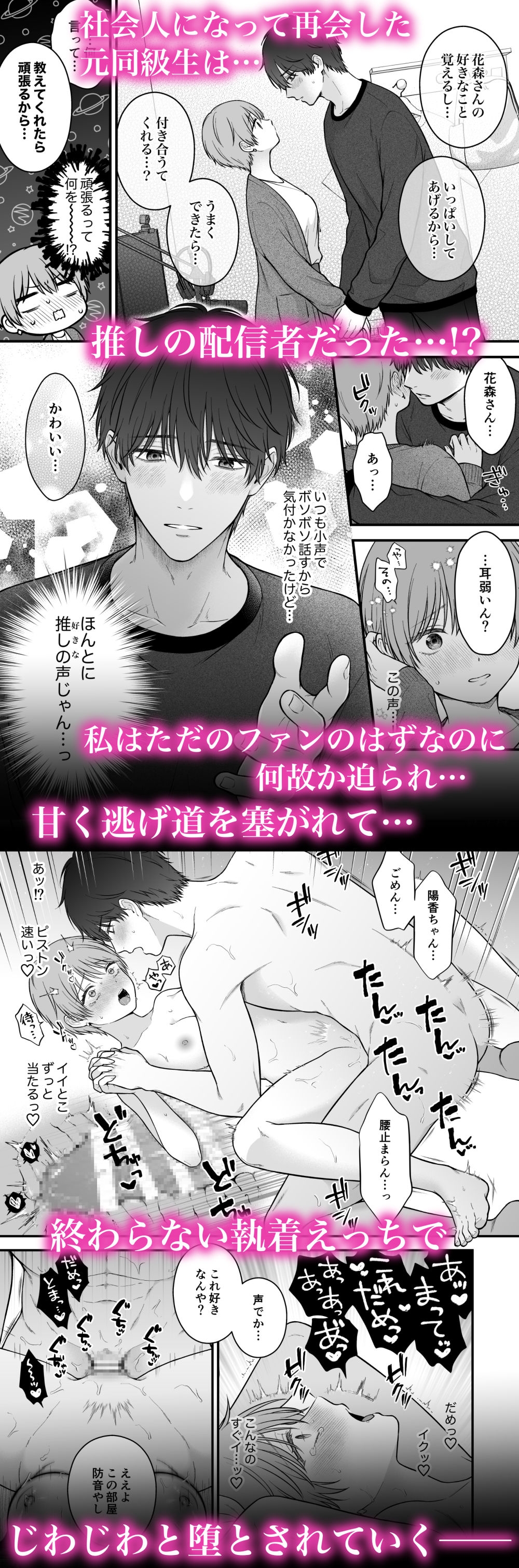 あらすじ 残業帰り、最寄り駅で再会したのは 昔の同級生。 ある時、打ち明けられたのは、 彼が私の“推し配信者”であることで──!? ただのファンでいるつもりだったのに、 触れられるたびに崩れていく。 偶然の再会。 ……のはずだった。 甘く重い執着から、 もう逃げられない──。 【プレイ内容】 乳首責め 手マン クンニ 連続絶頂 中出し 断面図 正常位 後背位 本文40P #がるまにショートチャレンジ …