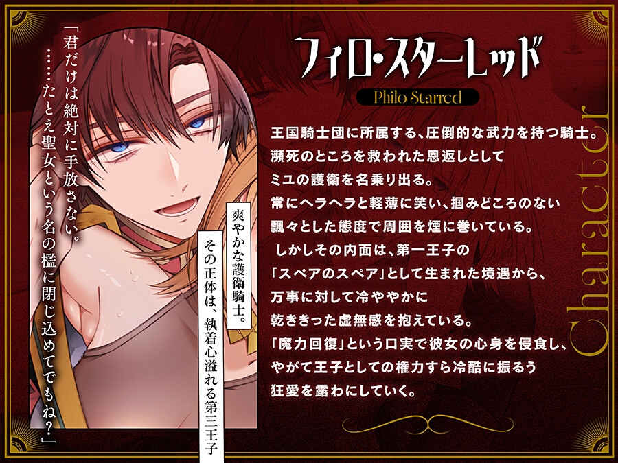 「君は命の恩人でしょ。だから一生をかけてその恩を返させてよ」 ♦体験版:冒頭23p(最初~1回目のR18シーン終了まで)+α ♦作品ワード 表面上明るいじっとり虚無ヤンデレお兄さん×異世界転生ヒロイン じっくり仲を深めていっているはずが、すれ違っていく系両片思いヤンデレ話 溺愛 ド執着 中出し ハート喘ぎ 連続絶頂 無理やり 和姦 クンニ 言葉攻め 嫉妬心や独占欲強め など ♦あらすじ 大好きだった女性向けソシャゲの世界に「聖女」として 転生してしまった「未由(ミユ)」 。 突然の出来事に動揺する中、まるで畳みかけるように 瀕死の重傷を負った騎士「フィロ」を発見してしまう。 「助かってよかったってことで!こういうのは出し惜しみせずに使うタイプな…